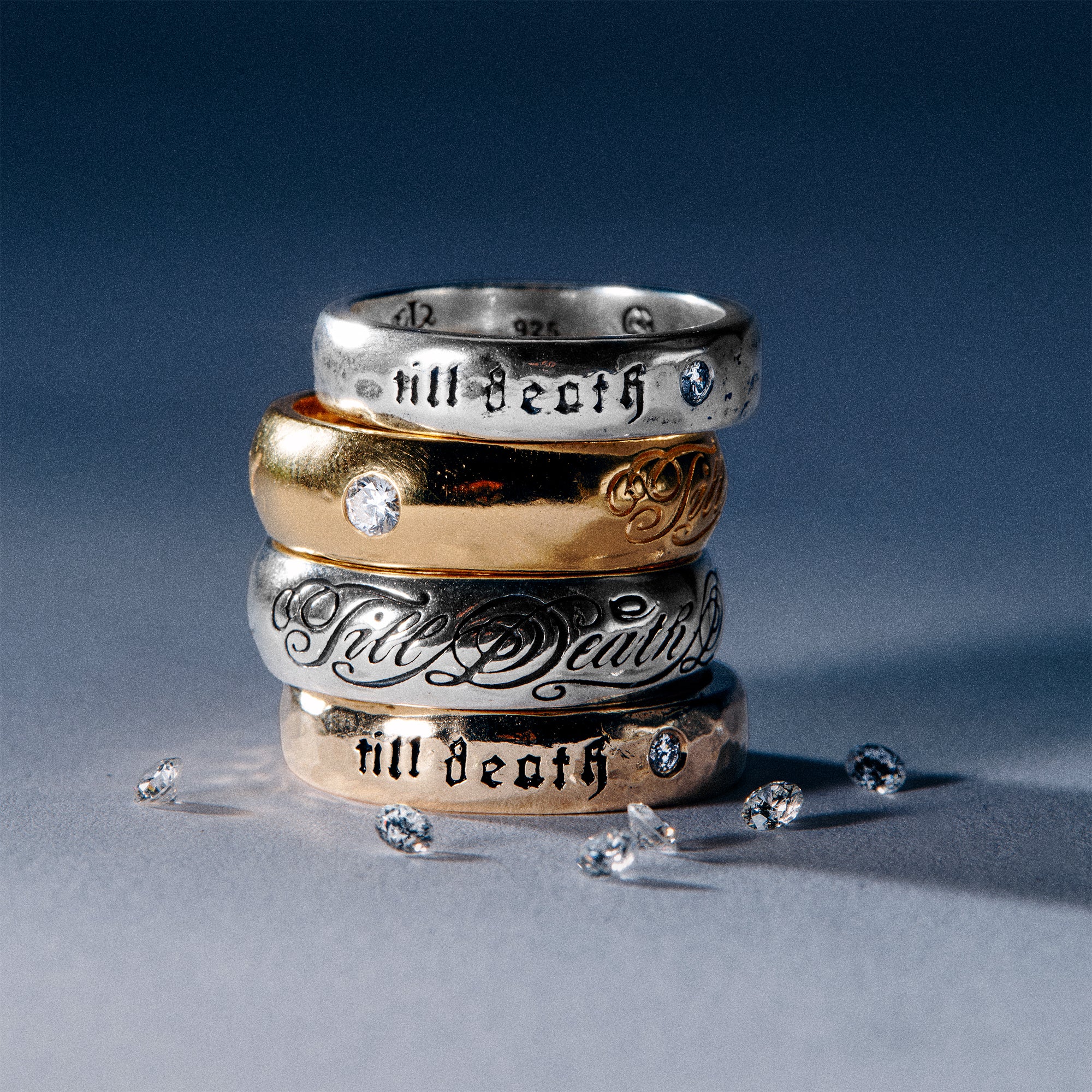 Two undead lovers wrap the inside, each reaching toward the other, with the diamond shining through between their hands. a secret symbol of devotion and love, and an ironic nod to love after death.